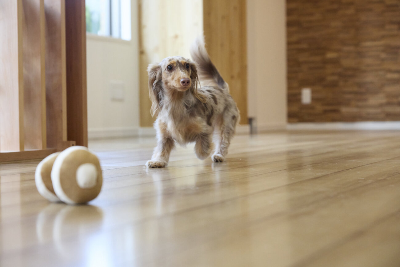息子ががまんできずに、ドッグライフコートのフローリングで駆け回り、それを楽しそうに追いかける大吉。